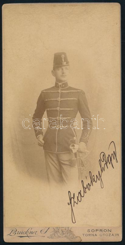 Leírás: cca 1900 Katonatiszt (Szabóky hadnagy) aláírt fotója, kabinetfotó Brücker Ignác soproni műterméből, kissé foltos, 21x10,5 cm