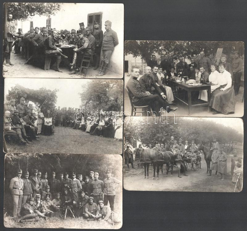 Leírás: cca 1915 Katonai fotók, közte csoportkép Schwarzlose géppuskával, mise, katonák civilek társaságában, 5 db fotólap, 9x14 cm