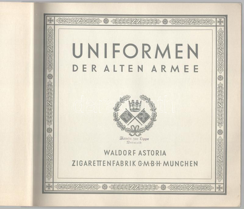 cca 1930 Uniformen der alten Armee. Waldorf Astoria Zigarettenfabrik GmbH München. Régi katonai egyenruhákat bemutató német cigarettakép-gyűjtőalbum, 311 db beragasztott képpel (csak egy kép hiányzik). Kiadói papírkötés, minimálisan sérült borítóval.