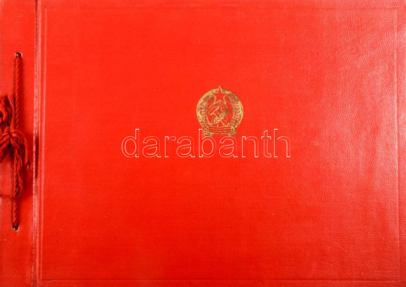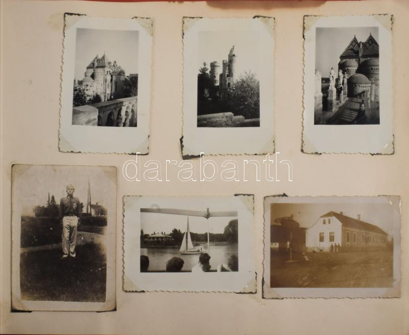 cca 1940-1950 Fodor Gyula fényképalbuma, számos katonai témájú fotóval (főként a Néphadsereg idejéből, de közte a M. Kir. Honvéd Légierő repülőtisztje, illetve levente fiú fotója is), részben személyes (családi, utazási) képekkel, összesen kb. 40-50 db fotó, változó méretben és állapotban, Kádár-címeres, zsinórfűzéses albumban, 21,5x30 cm