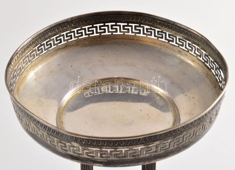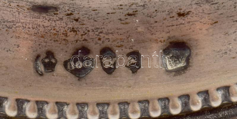Leírás: Ezüst (Ag) kínáló, nemesi címer rajzzal. Jelzett, üveg betét nélkül. 261g.