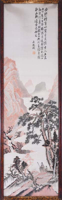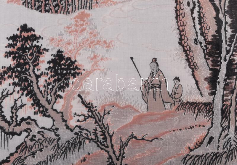 Leírás: Olvashatatlan jelzéssel, kínai alkotó, XX. sz. közepe: Vándorok. Selyemkép. Tetején elszíneződéssel. Üvegezett fakeretben. 92×27 cm