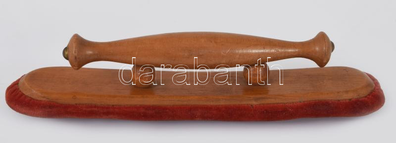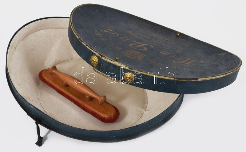 Leírás: cca 20. sz. eleje, Herm. Poetzsch kalap- vagy fejfedőtartó, benne simítóval, kopással, 33x27 cm