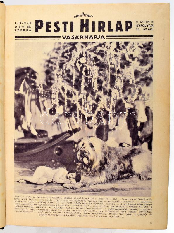 1929-1930 Pesti Hírlap Vasárnapja kolligátum: 1929. dec. 25. és 1930. jún. 29. közötti számok egybekötve, benne számos érdekes írással (pl.: A legszebb magyar képek. - Munkácsy Mihály: Golgota.; gróf Széchenyi Zsigmond: Vadászataim Kelet-Afrikában.; stb.), képekkel. Egészvászon-kötésben, kissé kopottas borítóval.