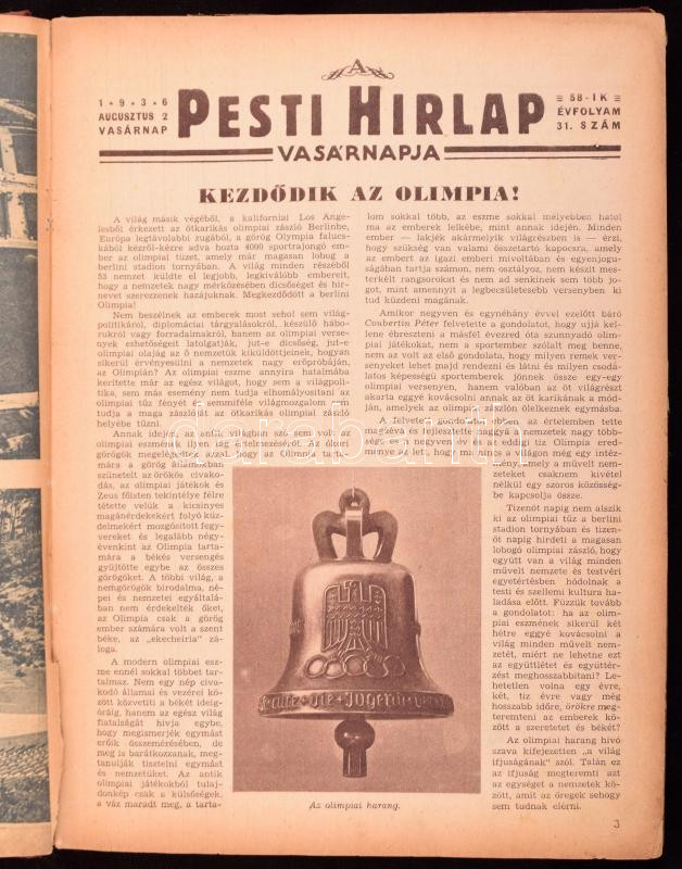 1936 A Pesti Hírlap Vasárnapjának vegyes számai könyvbe kötve, pl. ber... https://www.darabanth.com/hu/508-Gyorsarveres/508.0/Mutargy-papirregiseg-egyeb/Nyomtatvanyok~852/1936-A-Pesti-Hirlap-Vasarnapjanak-vegyes-szamai-konyvbe-kotve-pl-berlini-olimpia-felvaszo~II3441178