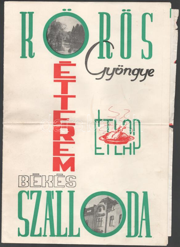 Leírás: 1974 Békés, Körös Gyöngye étterem étlap, hajtva, kis lapszéli sérülésekkel