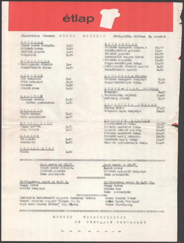 1974 Békés, Körös Gyöngye étterem étlap, hajtva, kis lapszéli sérülése... https://www.darabanth.com/hu/508-Gyorsarveres/508.0/Mutargy-papirregiseg-egyeb/Nyomtatvanyok~852/1974-Bekes-Koros-Gyongye-etterem-etlap-hajtva-kis-lapszeli-serulesekkel~II3439385