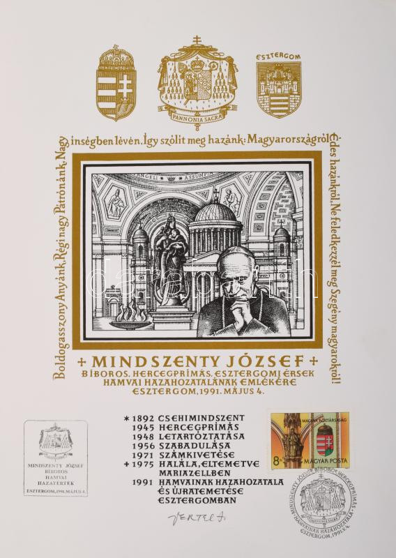 Leírás: 1991 Mindszenty József hercegprímás hamvainak hazahozatala emlékére kiadott emléklap Vertel József tervező aláírásával, alkalmi bélyegzéssel.