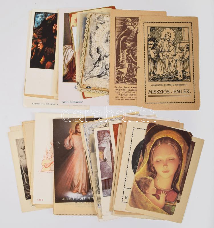 Leírás: 85 db szentkép és vallási aprónyomtatvány, vegyes állapotban