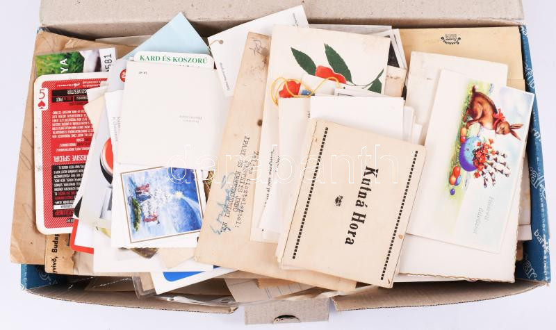 Leírás: Egy doboznyi papírrégiség: üdvözlőkártyák, levelezőlapok, birodalmi német okmány, stb.