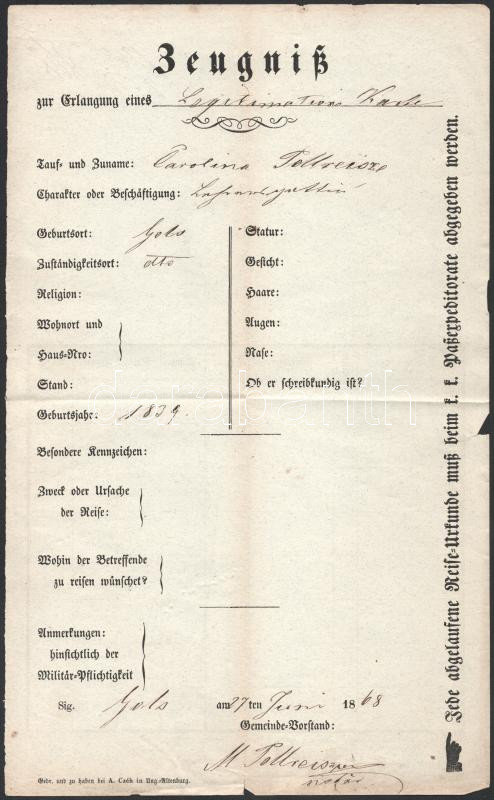 1868 Gálos (Gols/Gojza), Zeugniß (bizonyítvány) https://www.darabanth.com/hu/508-Gyorsarveres/508.0/Mutargy-papirregiseg-egyeb/Okmanyok~679/1868-Galos-GolsGojza-ZeugniC39F-bizonyitvany~II3443594