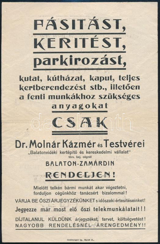 1926 Balatonzamárdiban működő Molnár K. kertépítő cég reklám szórólapj... https://www.darabanth.com/hu/508-Gyorsarveres/508.0/Mutargy-papirregiseg-egyeb/Reklam~684/1926-Balatonzamardiban-mukodo-Molnar-K-kertepito-ceg-reklam-szorolapja-jo-allapotban~II3441934