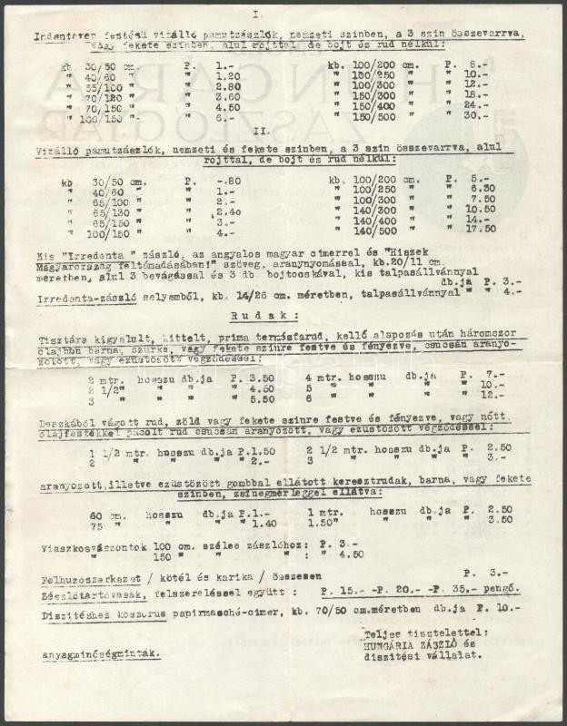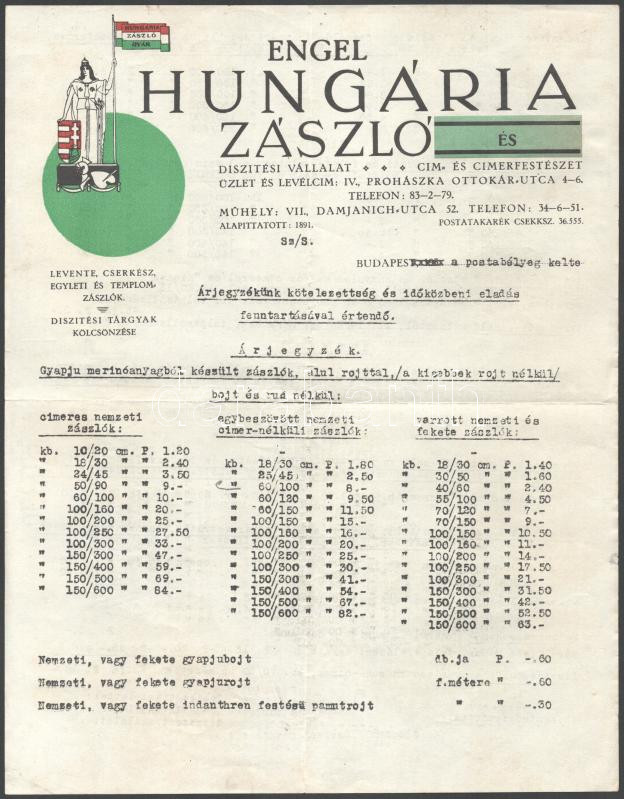 Leírás: cca 1930 Az Engel Hungária Zászló és Díszítési Vállalat dekoratív fejlécű kétoldalas árjegyzéke, hajtva, szép állapotban