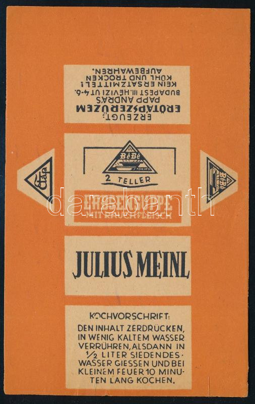 Leírás: cca 1940 Julius Meinl német nyelvű borsóleves címke, gyártja: Papp András Erőtápszerüzem Bp., 13,5x8,5 cm