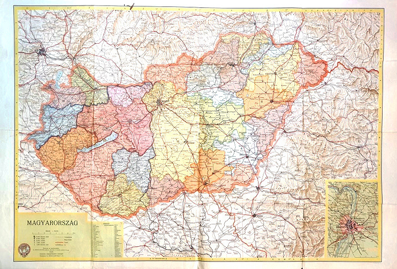Színes közigazgatási térképünk a domborzati, vízrajzi, közlekedésföldrajzi és településhálózati részletek mellett a megyebeosztásról ad információkat: országtérképünk közepén Pest-Pilis-Solt-Kiskun vármegye óriási területe; Sopron és Győr-Moson megyék, Borsod-Gömör, Abaúj és Zemplén megyék, Szabolcs és Szatmár megyék, Hajdú és Bihar, Csongrád és Csanád megyék egyelőre egyesítetlenek, a polgári hagyományú Balassagyarmat székhelyű Nógrád-Hont vármegye a Börzsöny egészét tartalmazva a Duna-kanyar északi tömbjét birtokolja, Komárom-Esztergom vármegye pedig még az egyházi központ, Esztergom székhellyel szerveződik. Az 1950-es megyerendezés során az agrárius Zala megye elveszíti az ipari körzetnek szánt Veszprém megyével szemben a teljes Balaton-felvidéket, Veszprém megye siófoki nyúlványa pedig végképp Somogyhoz kerül, Somogy pedig átadja szigetvári járását Baranyának. Az utolsó koalíciós évben kiadott dokumentumunk határon túli területein a domborzati névanyag magyar, a települések neve kettős nyelvű. Jelmagyarázat a bal alsó, az egyesítetlen Budapestnek és környékének melléktérképe a jobb alsó sarokban.