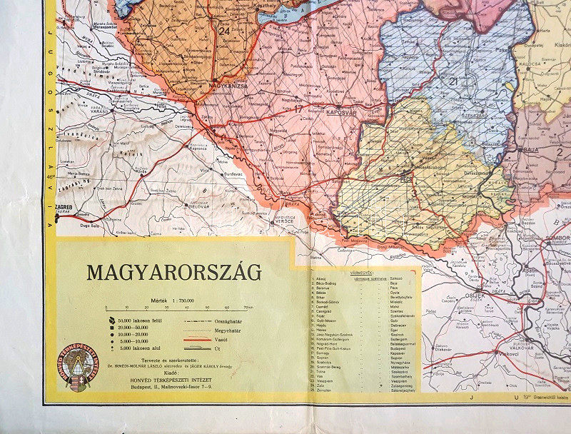 [Térkép] Magyarország közigazgatási térképe az 1950-es megyerendezést megelőzően. Tervezte Irmédi-Molnár László és Jäger Károly. Mértéke: 1:750,000. (1947).