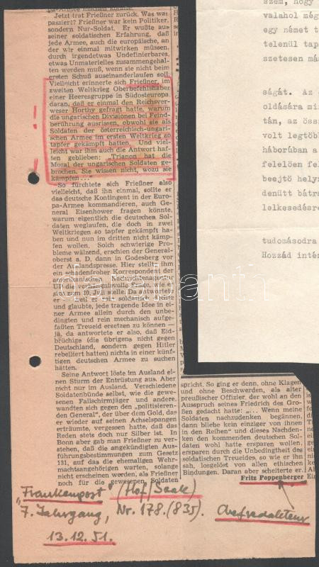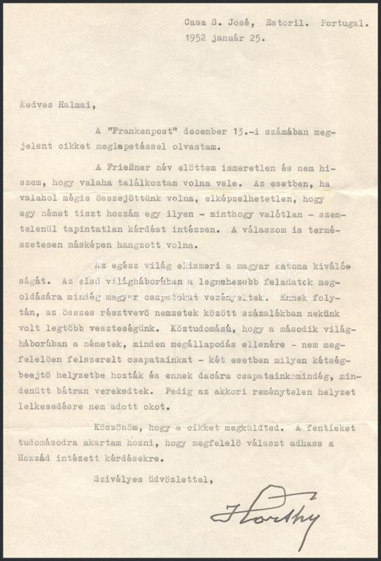 1952 Estoril, Casa S. José, 1952. január 25., vitéz nagybányai Horthy Miklós (1868-1957) gépelt levele, Halmai Jenőnek, autográf aláírásával, 1 gépelt oldal. "Kedves Halmai! A "Frankenpost" december 13.-i számában megjelent cikket meglepetéssel olvastam. [A kivágott cikk mellékelve.]... Az egész világ elismeri a magyar katona kiválóságát. Az első világháborúban a legnehezebb feladatok megoldására mindég magyar csapatokat vezényeltek. Ennek folytán, az összes résztvevő nemzetek között százalékban nekünk volt legtöbb veszteségünk. Köztudomású, hogy a második világháborúban a németek, minden megállapodás ellenére - nem megfelelöen felszerelt csaptainkat - két esetben milyen kétségbeejtő helyzetbe hozták és ennek dacára csapataink mindég, mindenütt bátran viselkedtek. Pedig az akkori reménytelen helyzet lelkesedésre nem adott okot. ..."