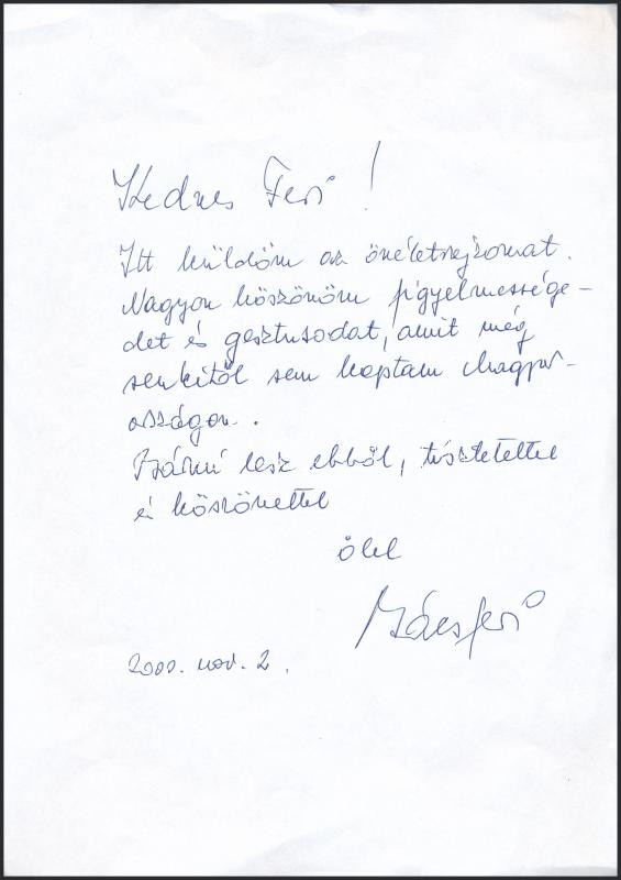 Leírás: 2000 Bács Ferenc (1936-2019) Kossuth díjas színművész autográf levele a Soproni színház igazgatójának, aki Érdemes művész címre.