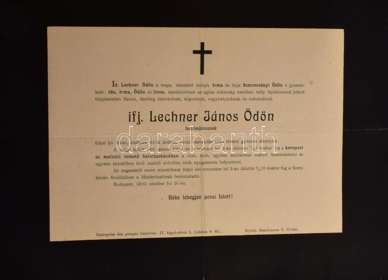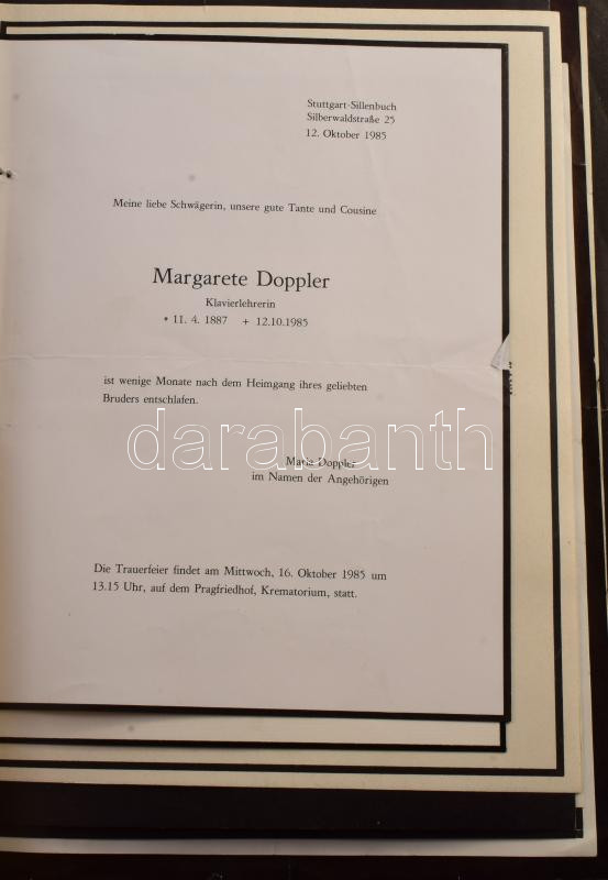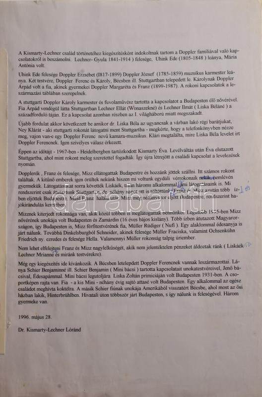 ca 1900-1980 A Kismarty-Lechner és a Doppler családhoz kapcsolódó halotti értestítők gyűjteménye, kb 100 db lefűzve, valamint Kismarty-Lechner Loránd (1883-1963) építész által összeállított gyűjtemény, levelekből aé fénymásolatokból a Doppler családról, melyben elmagyarázza a Diopplerek és a Kismarty Lechnerek kapcsolatát is. Egy mappányi, nagyrészt fénymásokat.