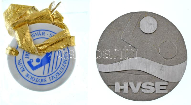 Leírás: 1979. "Nemzetközi SIÓTOUR Kupa Kaposvár - Siófok " egyoldalas kerámia díjérem, hátoldalán "PÉCS 1" jelzéssel, lyukasztva, szalagon + 1984. "HVSE / Nemzetközi Vízilabda Kupa " kétoldalas Al emlékérem, tokban T:AU,XF, karc, a tok szétmálik
