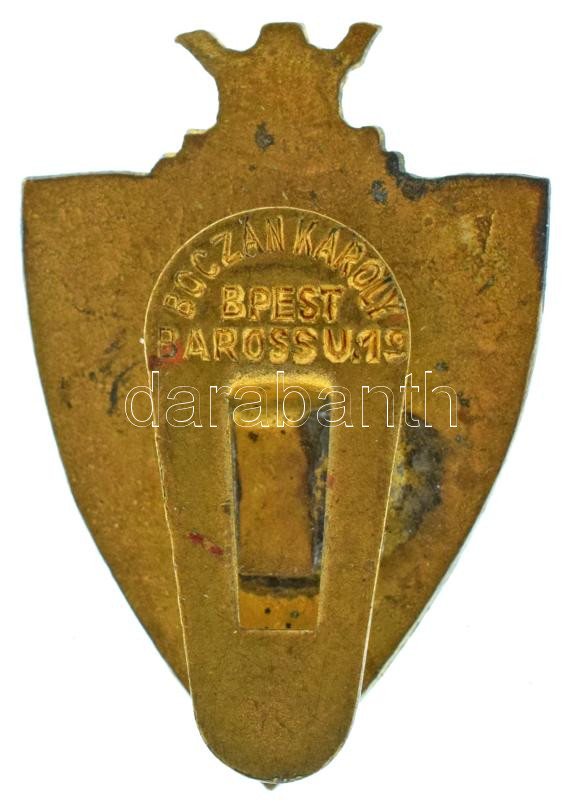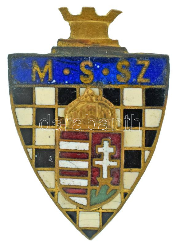 Leírás: DN (~1945) "M S SZ " (Magyar Sakk Szövetség) zománcozott, címer rátétes bronz jelvény, "BOCZÁN KÁROLY BPEST BAROSS U.19" gyártói jelzéssel a hátoldalán (19x27mm) T:AU