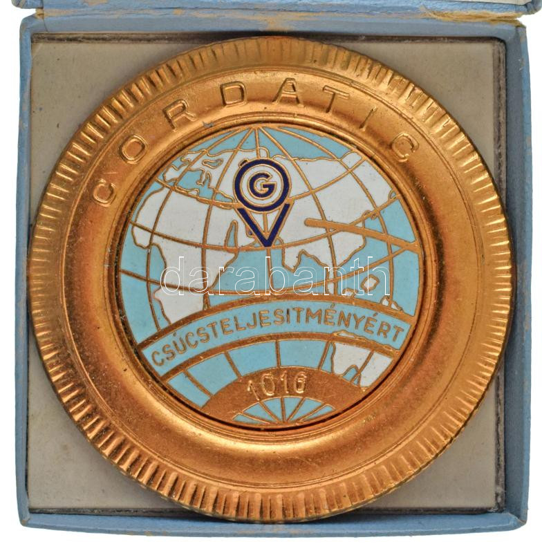 Leírás: DN (~1960) "CORDATIC OGV (Országos Gumiipari Vállalat) - Csúcsteljesítményért" zománcozott, aranyozott bronz hűtőrács dísz, "1016" sorszámmal, eredeti tokban (72,5mm) T:AU,XF