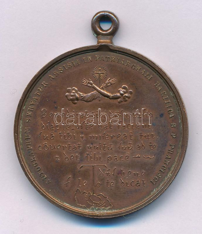 Leírás: Olaszország DN(~1960) "Assisi Szent Ferenc / Autogramja (kézírása) Assisiben őrzik, a Szent Ferenc pátriárkai Bazilikában " kétoldalas bronz emlékérem füllel (45,5mm) T:XF, patina, pici ph.