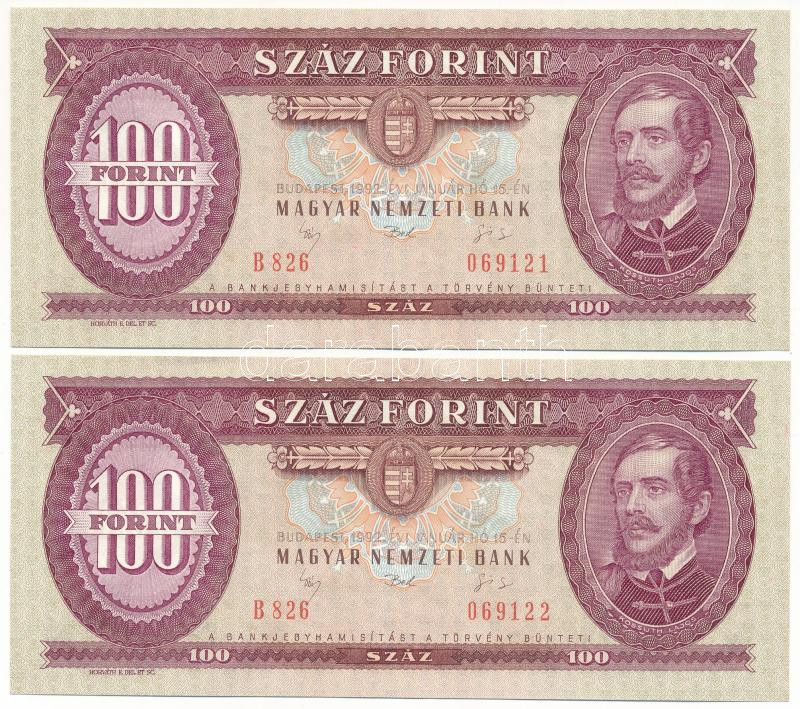 Leírás: 1992. 100Ft (2x) sorszámkövetők "B 826 069121 - B 826 069122" T:F, szép papír