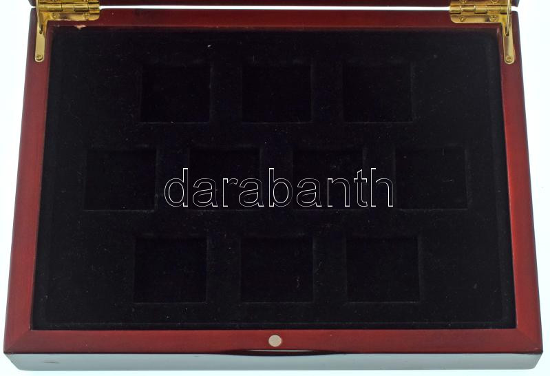 Leírás: 1db mahagóni éremtartó tok használt, jó állapotban, 10db férőhellyel, 34x34mm (négyszögletes "quadrum" kapszulához), külső méretek: 280x180x52mm