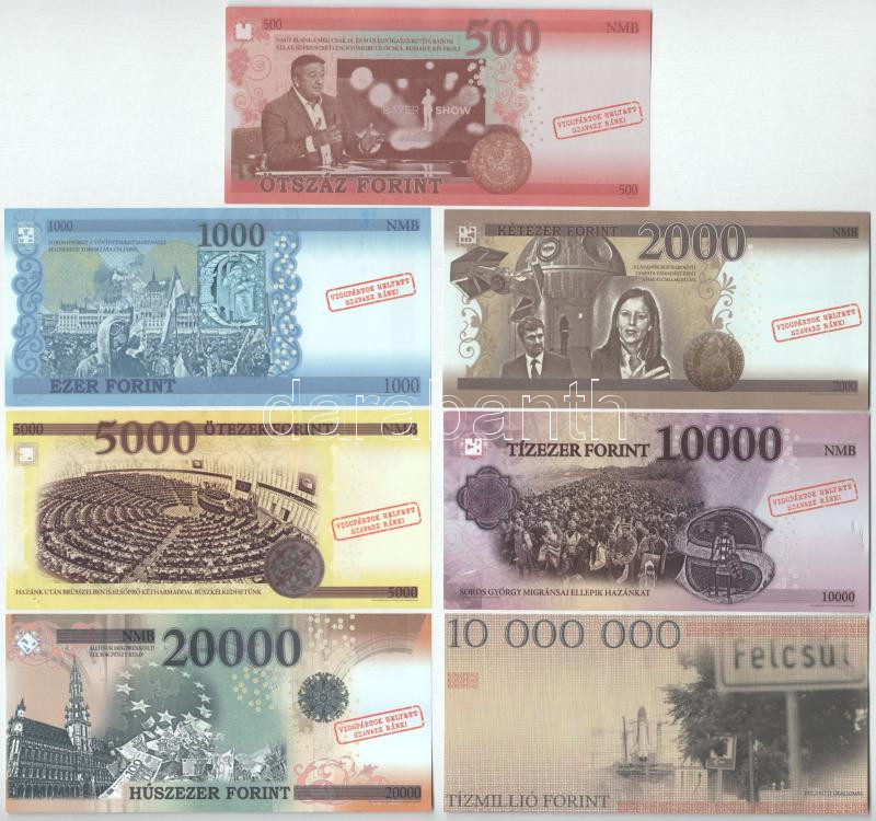 2018. 500Ft-20.000Ft (6xklf) "Soros pénz" teljes fantázia bankjegy sor + 2017. 10.000.000Ft "köszpénz" fantázia bankjegy az MKKP elnöke, Kovács Gergely arcképével T:XF,VF