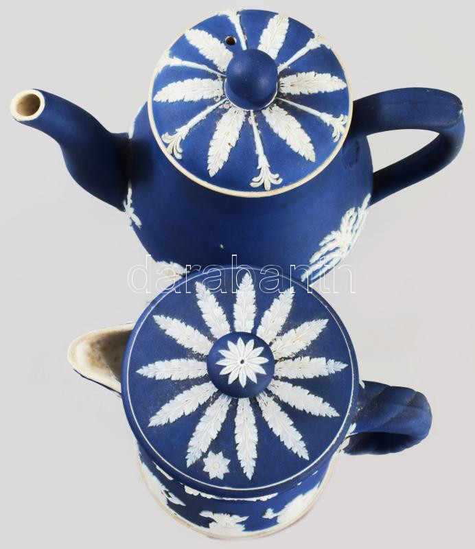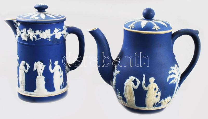 Leírás: 1890 vagy 1916, 2 darab Wedgwood jasperware díszítéses fedeles kiöntő. Jelzett, lepattanással, restaurált, m: 12-13 cm