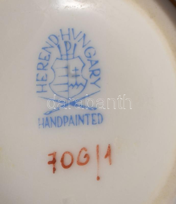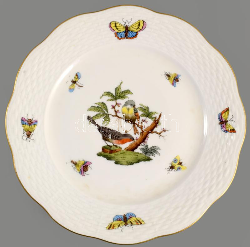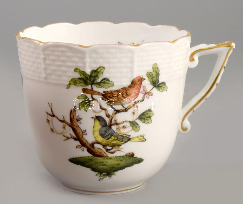 Leírás: Herendi Rothschild mintás egyszemélyes reggeliző szett, csésze alátéttel és desszertes tányér. Jelzett, minimális karcokkal, csésze aranyozáson kis kopással d: 19,5 cm