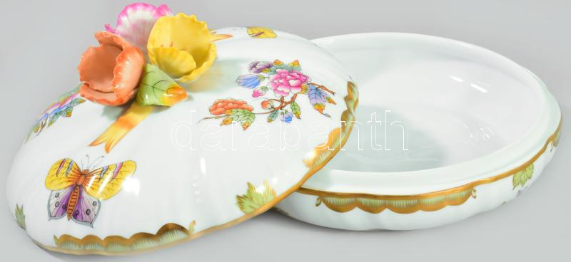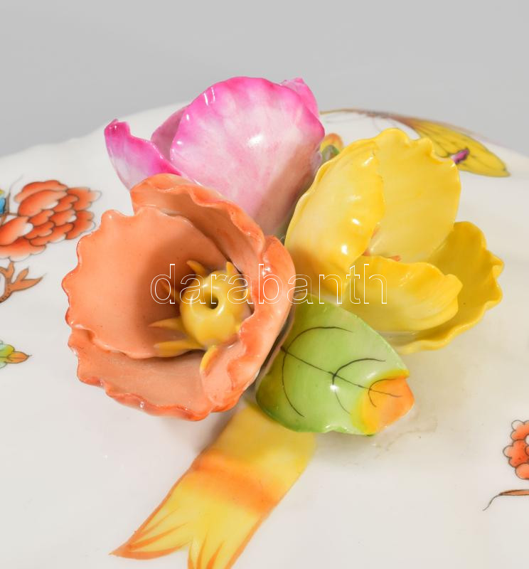 Leírás: Herendi Viktória mintás fedeles edény, vékony virágszirom fogókkal, jelzett, hibátlan, d: 16,5 cm