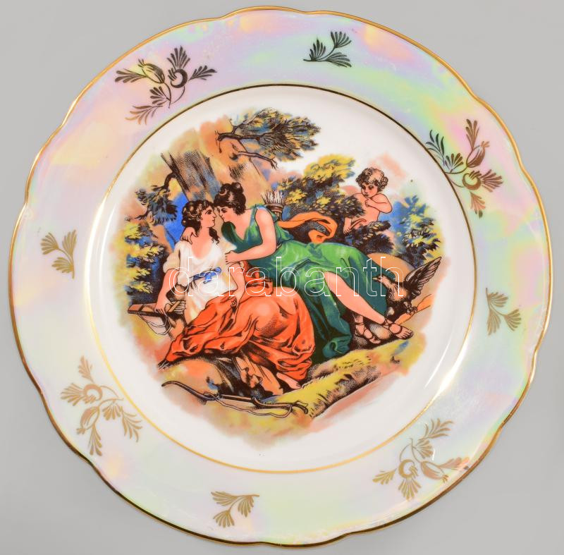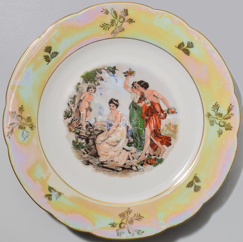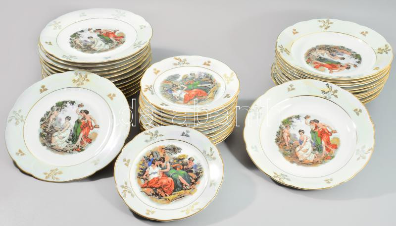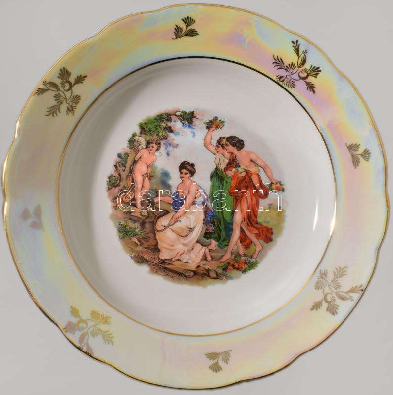 Leírás: Kahla 12 személyes historizáló mintás tál készlet, klf mintákkal, irizáló peremrész dekorral, jelzett, 1 kistál sérült, d: 19-23,5 cm