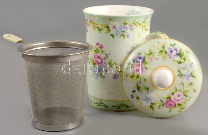 Leírás: Kínai porcelán fedeles teás bögre, szűrővel, jelzett, m: 13 cm