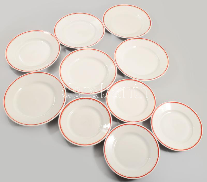 Leírás: Zsolnay 10 darab piroscsíkos tányér, 4 darab kistányér d: 19,5 cm, 6 darab mélytányér d: 24 cm, jelzett, kopással.