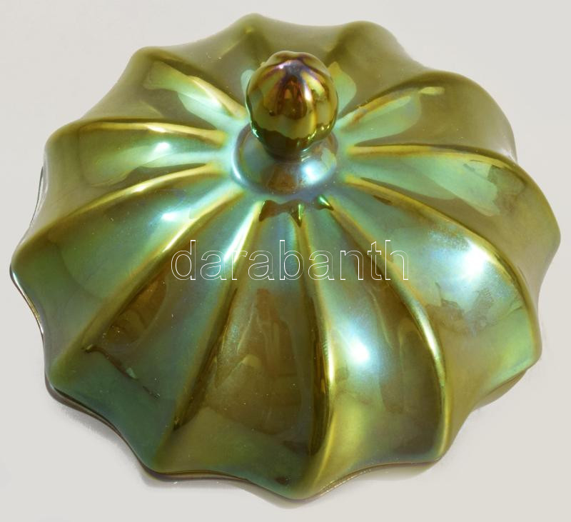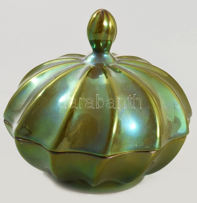 Leírás: Zsolnay eozinmázas csavartbordás bonbonier. Jelzett, hibátlan, eredeti dobozában, d: 11 cm, m: 10 cm