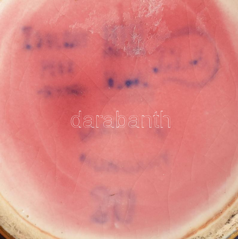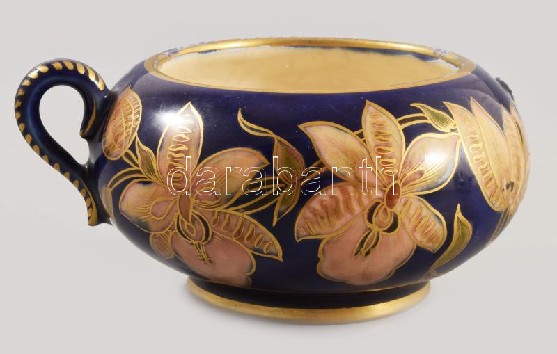 Leírás: Zsolnay kék és virág mintás cukordoboz. Családi pecséttel jelzett, kézzel festett, sérült. d: 10 cm