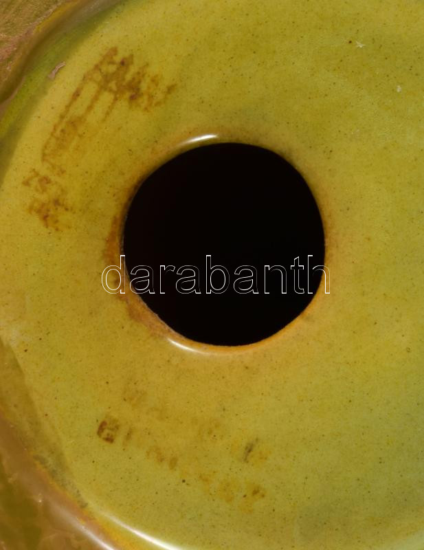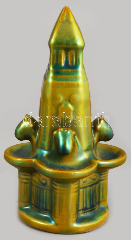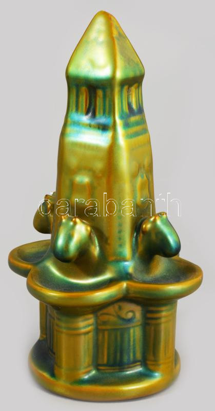 Leírás: Zsolnay kisplasztika - pécsi Zsolnay-kút. Terv.: Sinkó András. Savmaratott felületű, többféle eozin mázakkal fedett finomfajansz. Jelzett, hibátlan, m: 14 cm