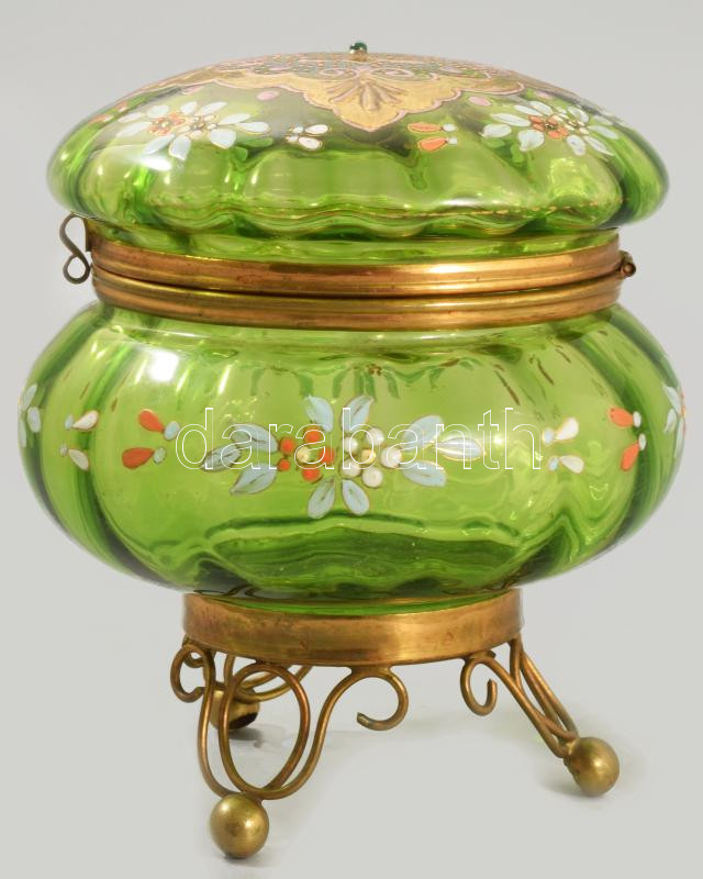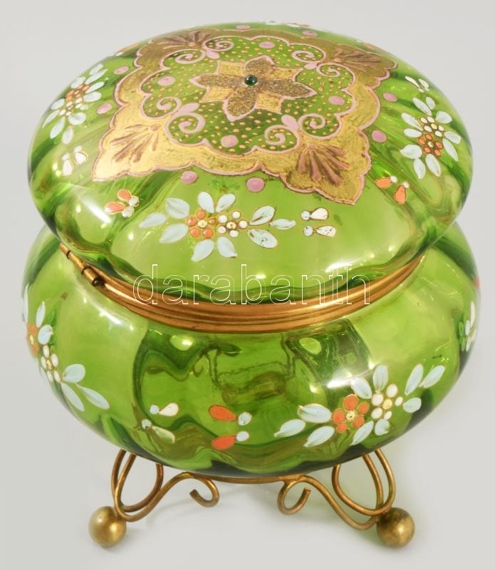 Leírás: Zöld üveg bonbonniere. Kézzel festett, fém szerelékkel. hibátlan d: 12 cm