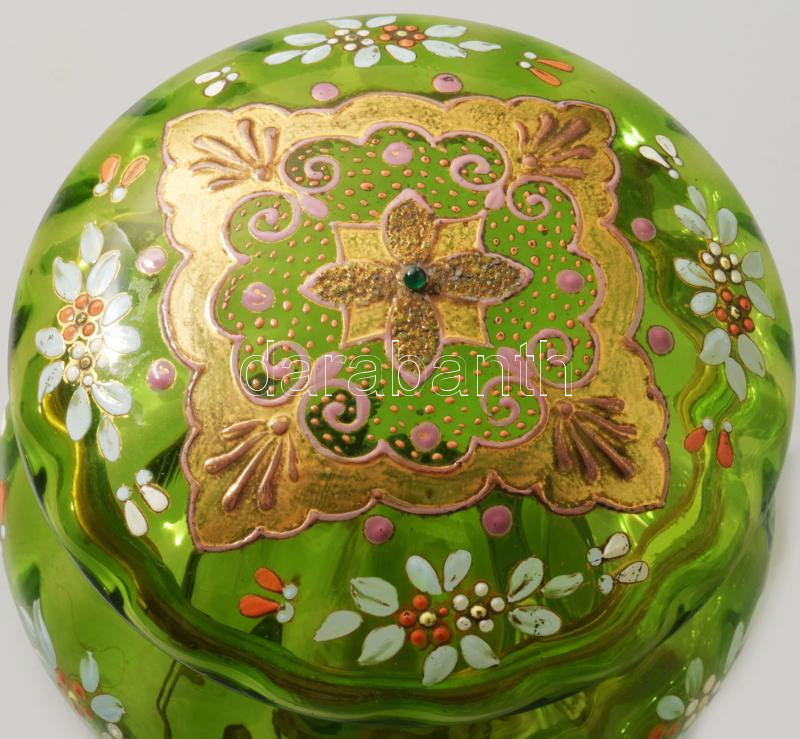 Zöld üveg bonbonniere. Kézzel festett, fém szerelékkel. hibátlan d: 12... https://www.darabanth.com/hu/508-Gyorsarveres/508.0/Porcelan-keramia-uveg/Uvegtargyak~64/Zold-uveg-bonbonniere-Kezzel-festett-fem-szerelekkel-hibatlan-d-12-cm~II3435226