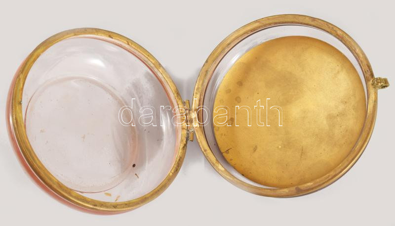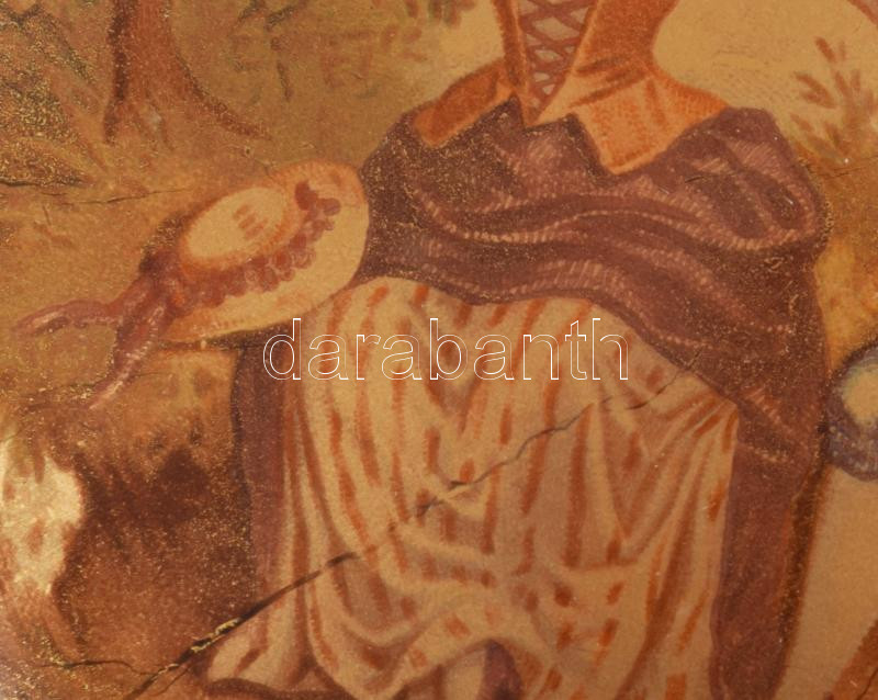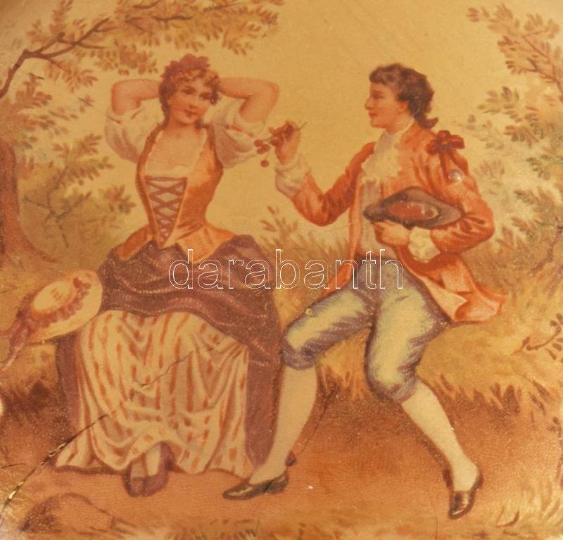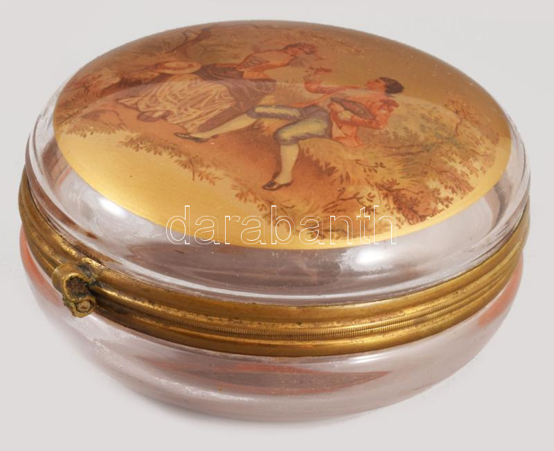 Leírás: cca 19. sz. második fele, Kézzel festett zsánerjelenetes üveg bonbonier, kopással, d: 9,5 cm