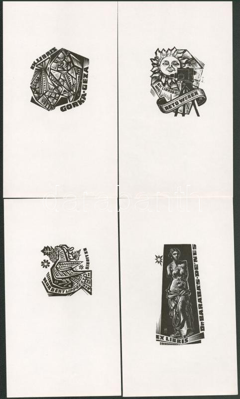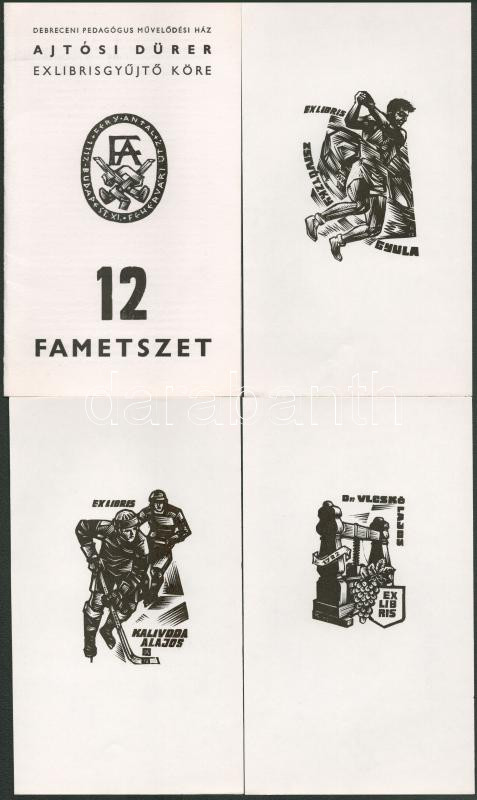 Fery Antal (1908-1994): 12 fametszet. Fametszet, papír, mindegyik jelzett a metszeten. Debreceni Pedagógus Művelődési Ház, Ajtósi Dürer Exlibrisgyűjtő Köre kiadása. Közte Ex libris Gorka Géza, ex libris Zsivótzky Gyula stb. Eredeti kiadói, számozott (062/150 sz.) mappában. Lapméret: 20x12,5 cm. Komplett!