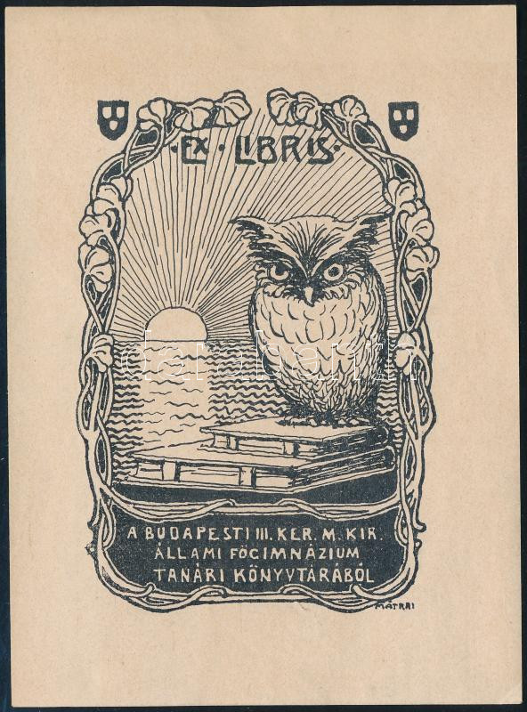 Mátrai Vilmos (1877-1961): Ex libris, a Budapesti III. ker. M. Kir. Állami Főgimnázium tanári könyvtárából (szecessziós könyvjegy). Fametszet, papír, jelzett a metszeten. 9×6 cm.