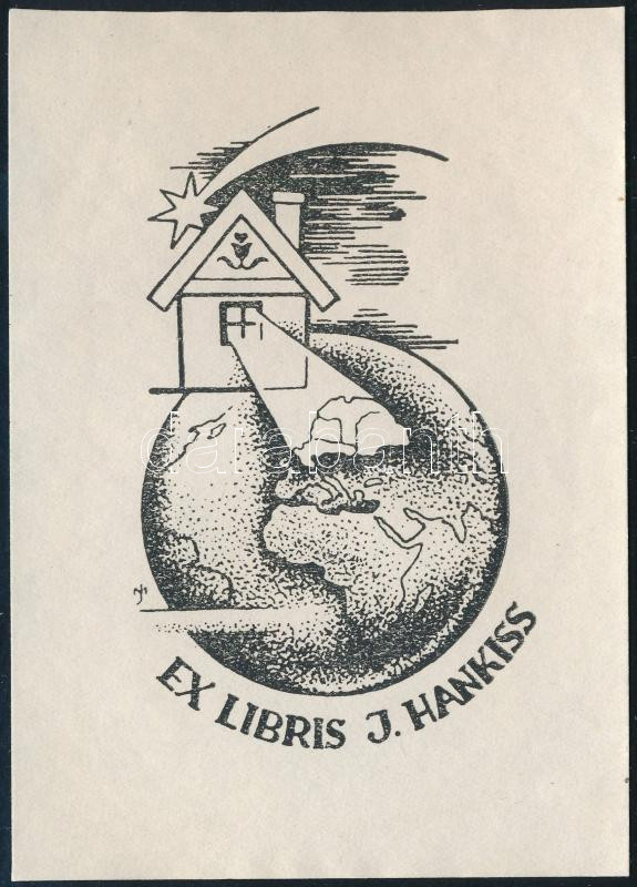 Leírás: Menyhárt József (1901-1976): Ex libris J. Hankiss (irredenta könyvjegy Nagy-Magyarország térképpel). Fametszet, papír, jelzett a metszeten, 7,5x5 cm
