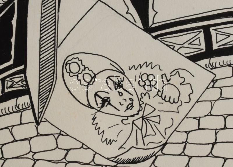 Leírás: Olvashatatlan jelzéssel: Mesevilág, 1989. Tus, papír. Paszpartu széle sérült. 51,5×36 cm