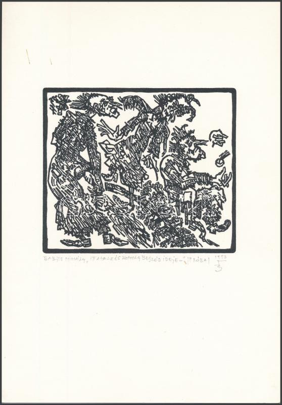 Banga Ferenc (1947-): Babits Mihály, "Itt a halk és komoly beszéd ideje". Linómetszet, papír, jelzett, próbanyomat próba jelzéssel. Rendkívül ritka próbanyomat a Babits mappához. Lapszéli apró elszíneződésekkel. 12x14 cm
