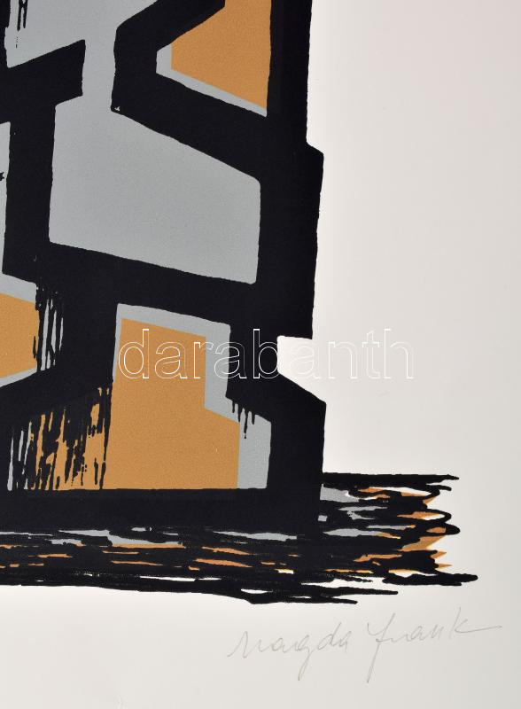 Leírás: Frank Magda (1914-1997): Geometrikus kompozíció. Szitanyomat, papír, jelzett, számozott (5/40), lapméret: 50x35 cm lap szélén kis gyűrődéssel