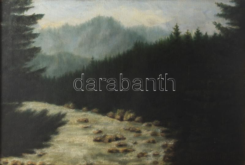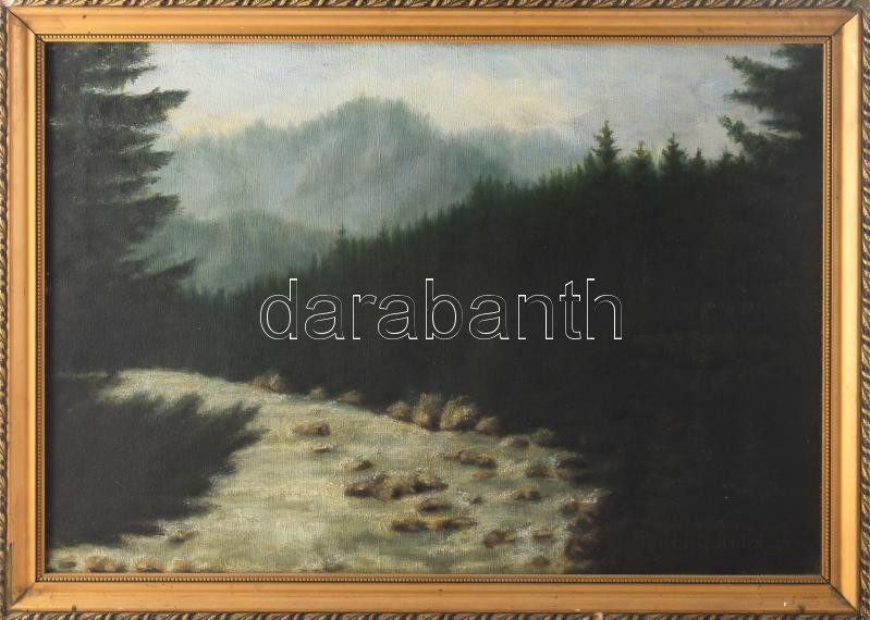 Leírás: Nagypolányi Pogány Antal (-): Hegyvidék (Tátra?), 1935. Olaj, vászon. Jelzett. Dekoratív, kissé sérült fakeretben. 35x50 cm