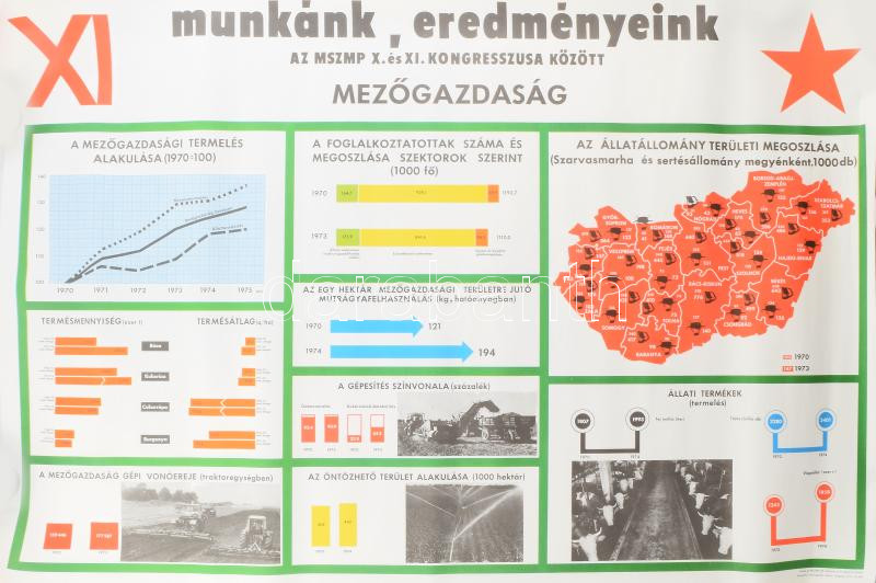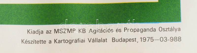 1975 Munkánk, eredményeink az MSZMP X. és XI. kongresszusa között, mezőgazdaság, szocialista propaganda plakát, papír, Kartográfiai Vállalat, kiadja MSZMP KB Agitprop Osztálya, feltekerve, 67×98 cm